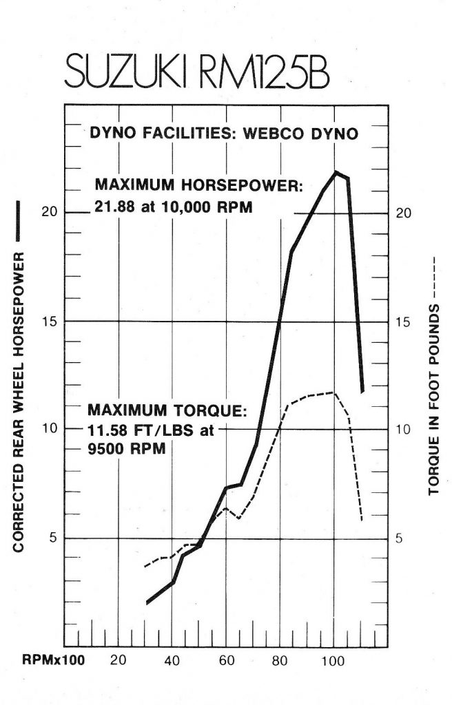 All or nothing: The RM’s 21.88 horsepower does not sound like a lot by modern standards but this was near the top of the class in 1979. One look at that incredibly steep power curve is enough to give you a sense of just how peaky the powerband was on these pre-power-valved small bores. Photo Credit: Cycle World