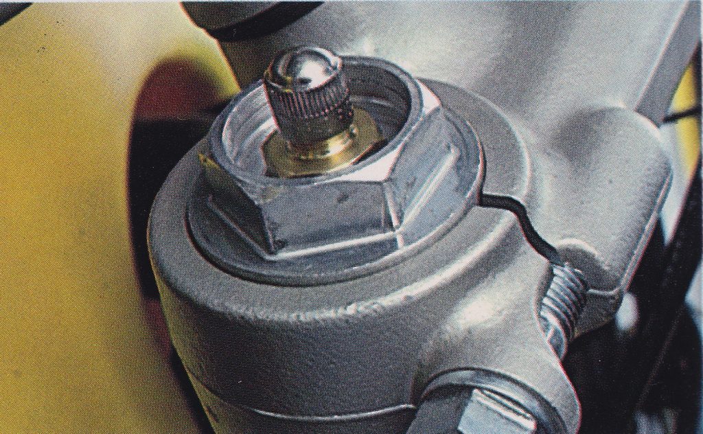 This is what passed for fork adjustment in the 1970s. These Schrader valves attached to the top of each fork allowed air to be added or subtracted to fine-tune the ride. Unlike modern air forks, this pneumatic assist was designed as a supplement to the coil springs and not a replacement for them. Photo Credit: Suzuki