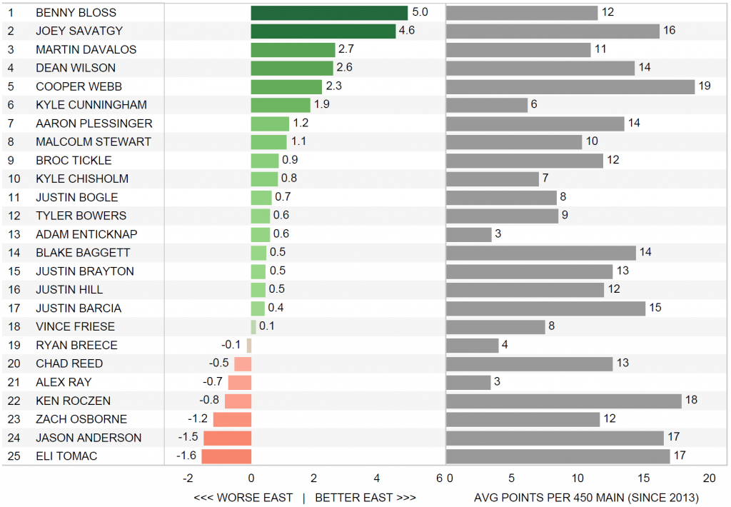 Well lookee here. Benny Bloss has the biggest jump from west to east but small sample size for sure. Still it’s something to keep in mind. I thought before we did this research that Cooper Webb would be on this list as a most improved on the east and yeah, look at that. Nobody is a huge difference though to be sure. Still, two points better per main for Webb on the east is something right? Martin Davalos, yeah that’s also predictable- he’s always lived and mostly practiced on the east coast so that type of dirt has to be familiar to him.