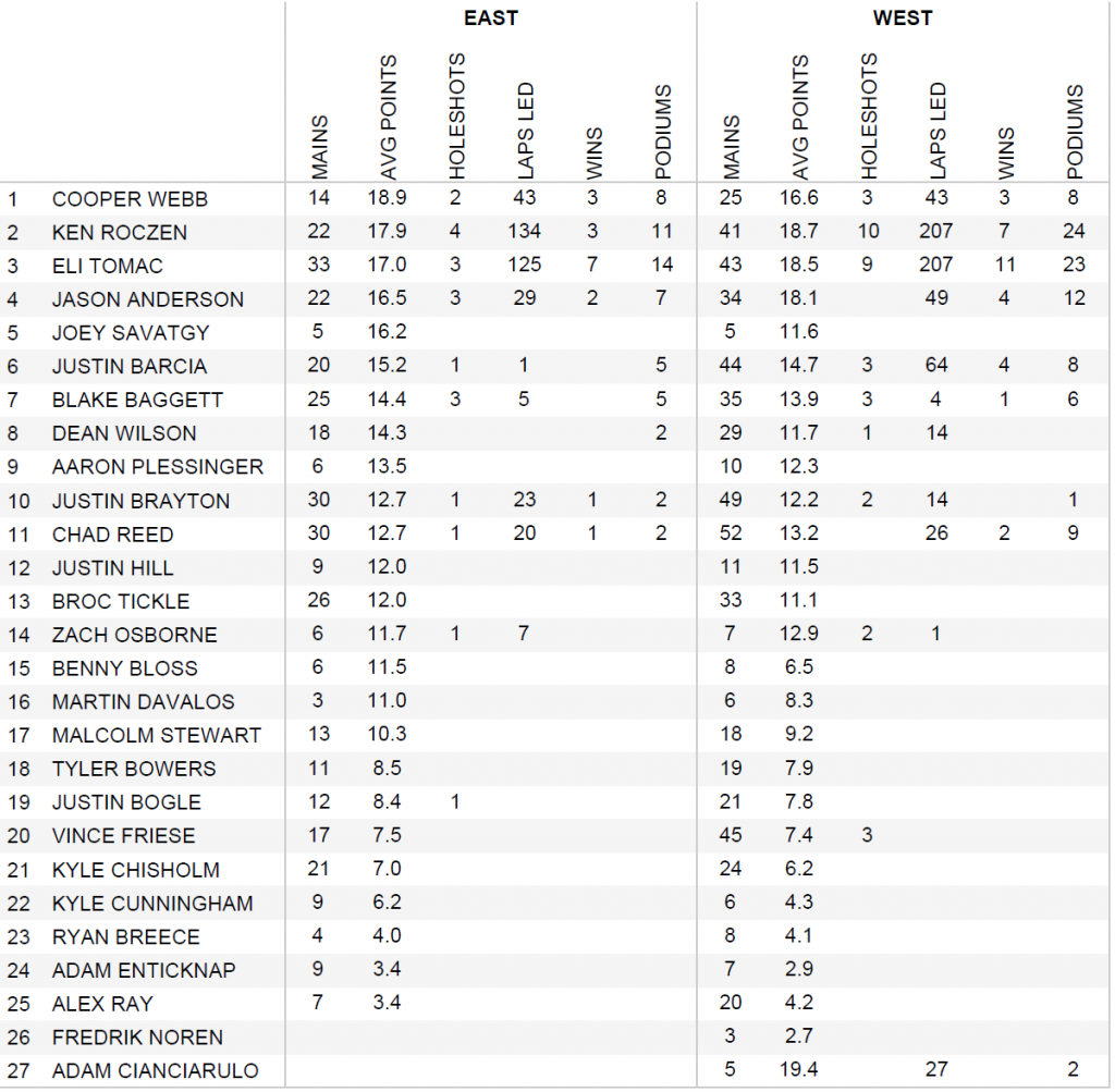 On the other end of the spectrum, it’s the west coast born and raised Jason Anderson near the bottom and Eli Tomac has THE worst points swing from east versus west. Again, not a huge dip here with almost two points difference but with no west coast races, it’ll be interesting to see if we see these trends continuing.