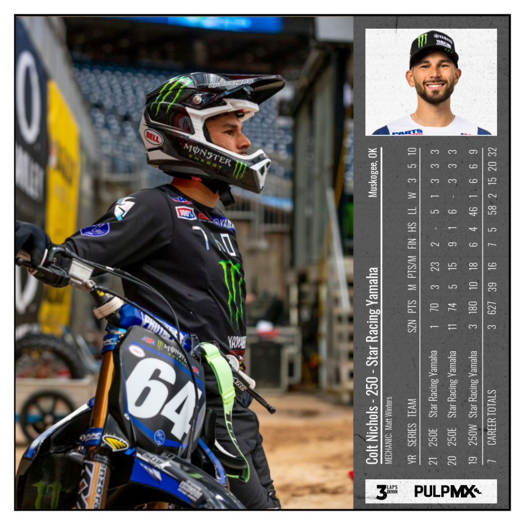 Colt Nichols history is not that different. Colt came out strong in his 2016 sophomore season finishing 5th overall in the series and grabbing his 1st podium. Unfortunately he was injured in both the 2017-18 seasons and only finished 6 total races. But in 2019 he got his 1st win and 6 podiums en route to 3rd overall in the championship behind Dylan Ferrandis and Adam Cianciarulo. Many thought 2020 was his year but another injury cut his season to only 4 rounds. He’s once again positioned to contend for a championship in 2021, finishing on the podium in all 3 rounds to start the season.