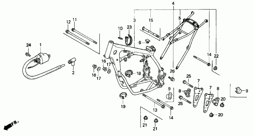 For 1991, Honda redesigned the CR’s frame to reclaim its lost position as the king of the corners in the 125 class. This was achieved by moving the steering stem down by 2.5mm and back by 1.5mm. Both the rake and trail were also reduced and the motor was repositioned to sit 3.5mm lower in the chassis. The new tighter angles reduced the Honda’s wheelbase by nearly half an inch and placed more weight on the front wheel for improved traction in the turns.