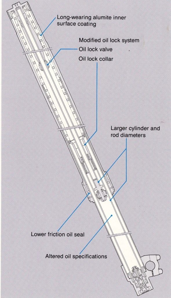 An all-new Showa inverted fork for 1991 featured a redesigned cartridge system and several updates aimed at reducing friction and increasing durability. Photo Credit: Honda