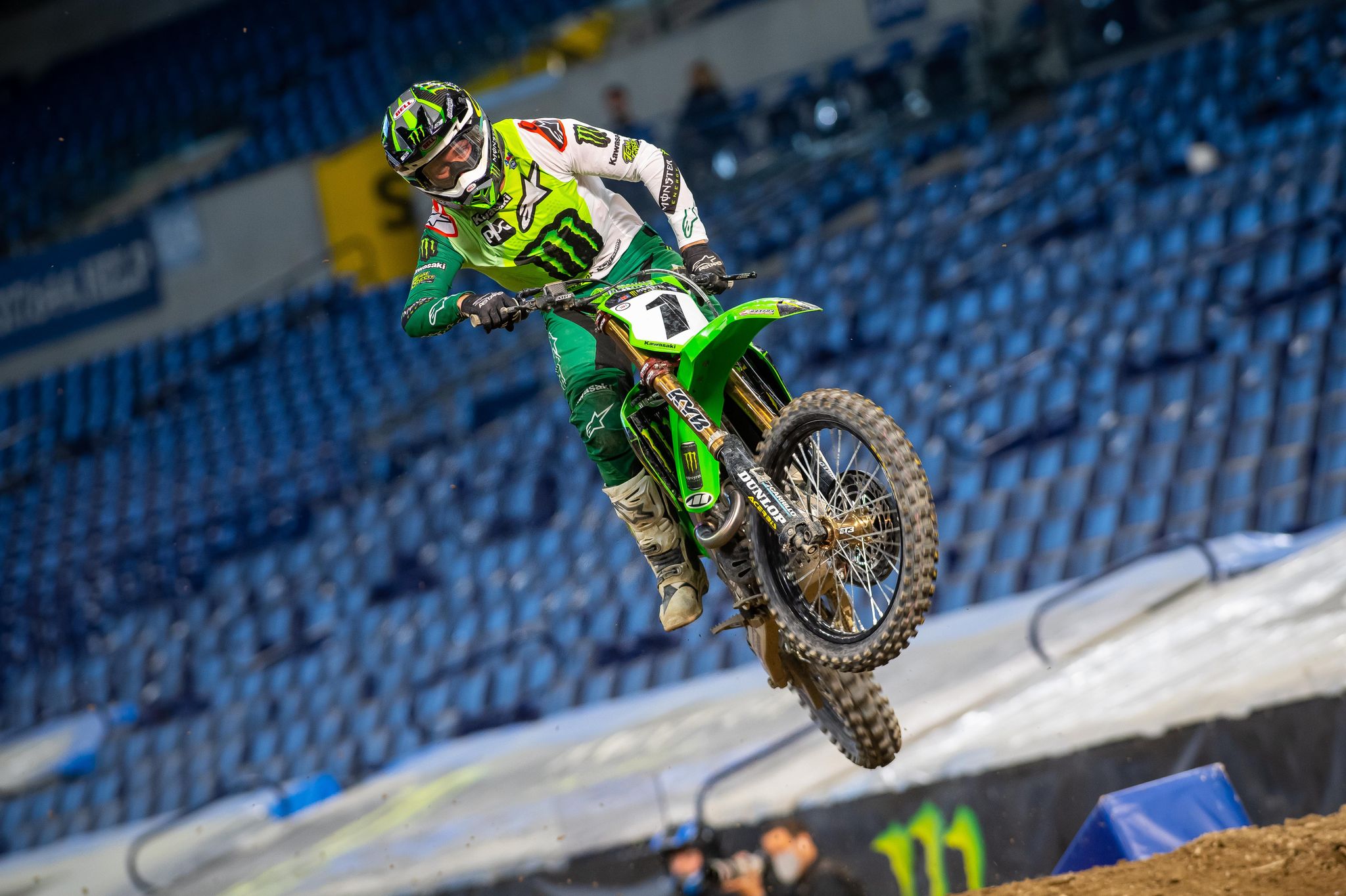 Eli Tomac’s Monster Energy Kawasaki KX450: Holy shit, Eli got a holeshot one time this season already! It can be done! I mean Adam gets good starts consistently so I know the bike has the power/drive/hookup, but it seems to be lacking in flat corners. After the whoop section at Indy 3, the Monster Energy KX450 looked to be a little long or maybe they had the wrong front tire, but it had a bad push. Eli was losing time there, until finally he picked up on that inside rut before the rhythm. The Kawasaki looks really good/calm in transitions/pockets of rhythm sections as well as the whoops. Feeling the rear of the bike squat in the whoops and drive is one of the most incredible feelings as a SX rider. Having enough comfort on initial touch (on each whoop) yet not getting a side to side deflection is a feeling most want and Eli/Adam seem to have that.