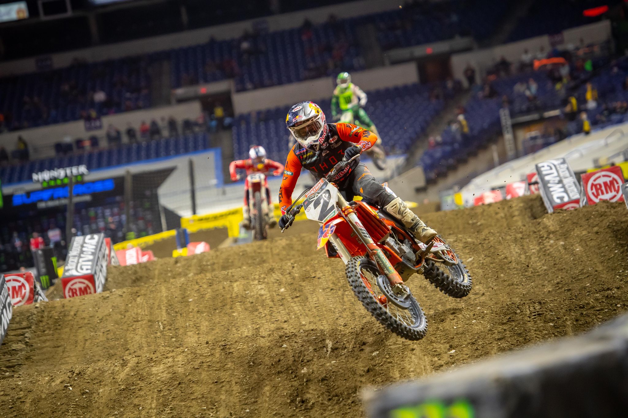 Cooper Webb’s Red Bull KTM 450 SX-F Factory Edition: This is probably the bike that I would love to ride the most if I could. Coop’s air shock looks low to me, but that could be Coop’s setting because Marv’s bike doesn’t seem to be that low. The KTM in production form is a deceiving engine character as it’s the easiest/mellowest of all 450’s, but when you had a few HP’s to it, this orange bike is INSANE! I could only imagine how well the Red Bull KTM is with that extra love. From what I see is that the KTM still has that easy to roll on power delivery, which gives Webb and Musquin the most rear end traction out of the 450 factory bunch. Roczen’s bike looks hooked up but the KTM’s seems to just have that extra bit when it gets shiny late in the main. In flat corners the bike looks to be low and biting into the ground unlike other bikes in the class where they ride a little higher in the stroke. I can see that Coop has changed something in Indy compared to Houston. He NOW can move around on the track more and search for different lines. In Houston it looked like he was kind of locked into his line and if he ventured out of that, the KTM didn’t work as well. Almost like he couldn’t push the bike in those different lines. He now can charge throughout the race even if he goes somewhere completely different. Cooper Webb is going to be dangerous moving forward and if he starts stringing off some good starts, watch out Kenny!