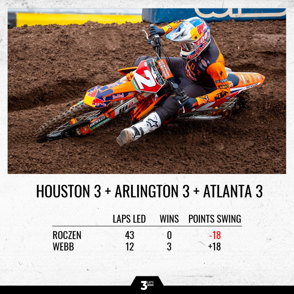 Webb passed Roczen on the last lap at round 3 in Houston after Dean Wilson disrupted Roczen’s flow. Webb led 3 total laps that night, the first two laps and the last one.