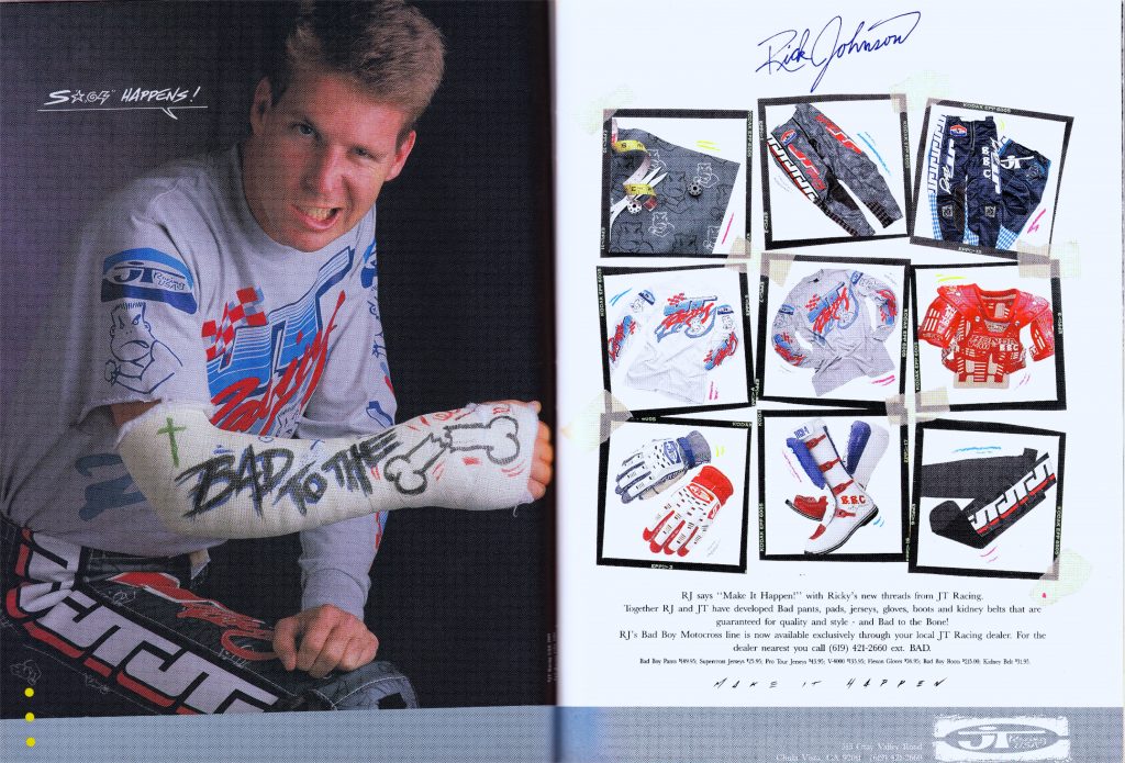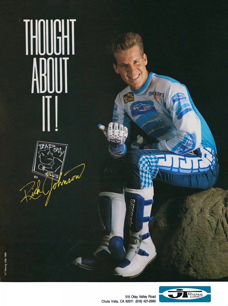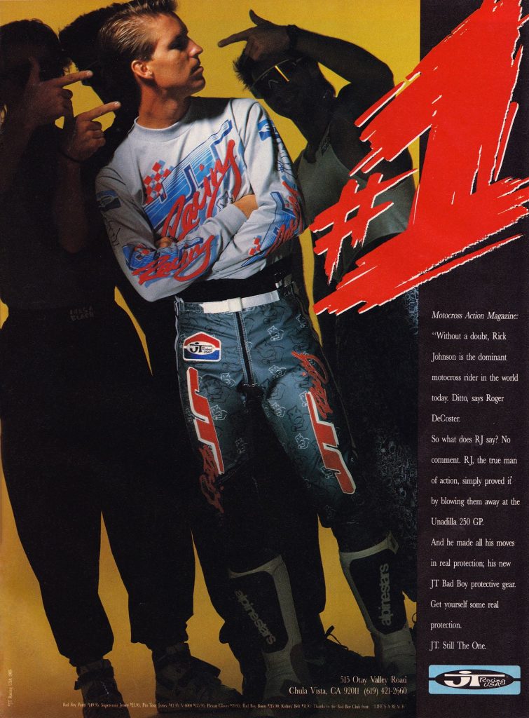 With such a late start, JT did not have much time to capitalize on Johnson’s popularity and ended up introducing a rather boring and uninspired line of gear based on Rick’s Life’s A Beach “Bad Boy Club” line of casual wear. While certainly not unattractive, it was a far cry from the red-hot Fox pattern designs being sported by Damon Bradshaw and Jeff Matiasevich. In a bit of irony, the 1989 JT Racing RJ signature gear actually most resembled the boring Hondaline TX-10 he had fought to not wear.