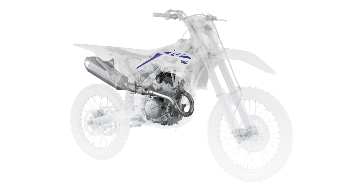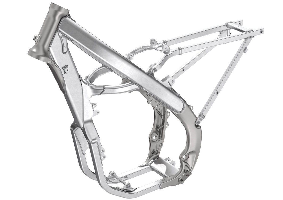 The aluminum frame is 1.5 pounds lighter for 2022, drawing heavily from the CRF450R. Updates include widely curved main spars with smaller cross-sections, plus optimized rib placement in the backs of the pivot plates. Longitudinal rigidity is maintained for straight-line stability, while lateral rigidity is reduced by 20 percent to enhance handling feel when cornering.