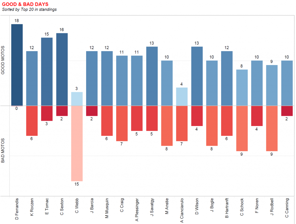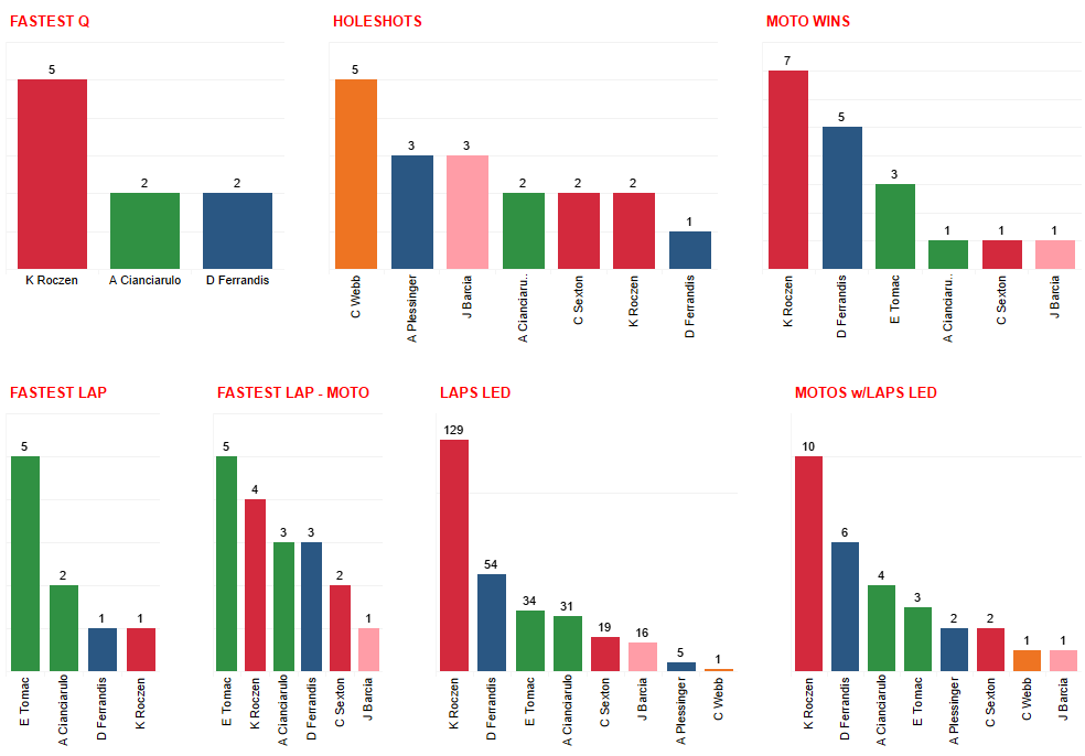 The one exception – Dylan Ferrandis hasn’t lost a position in a single moto all year (change between first and last lap). On the other hand, Ken Roczen has lost positions in 6 motos for a total of -25 lost points. If he had held his position in these 6 motos, he’d only be down -14 points to Dylan. 14 points is a significantly smaller deficit that could be made up in a weekend of racing. Unfortunately, Ken’s had a small handful of less than optimal motos that will make it near impossible to win this championship.