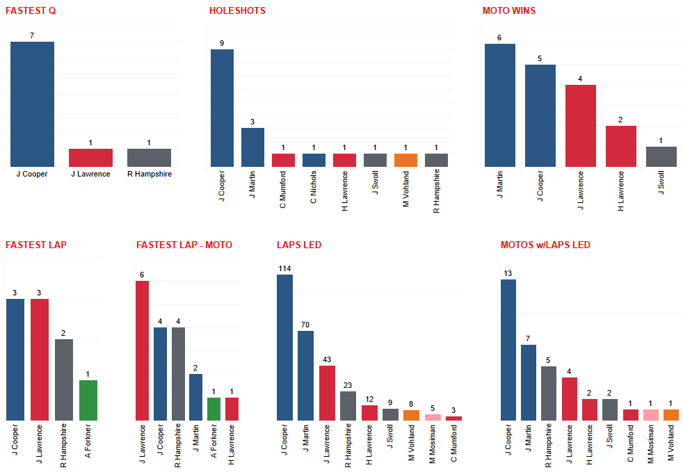 Unlike Dylan Ferrandis who’s leading the 450 championship but doesn’t lead a single key stat, Justin Cooper is leading the 250 championship AND almost all key stats. The only major stats category Justin doesn’t lead is Motos w/Fastest Lap – Jett Lawrence has 6 and Justin is tied for second with 4. Based just on the key stats, you’d expect Justin to be dominating the series, but instead he’s got a very small 3 point lead.