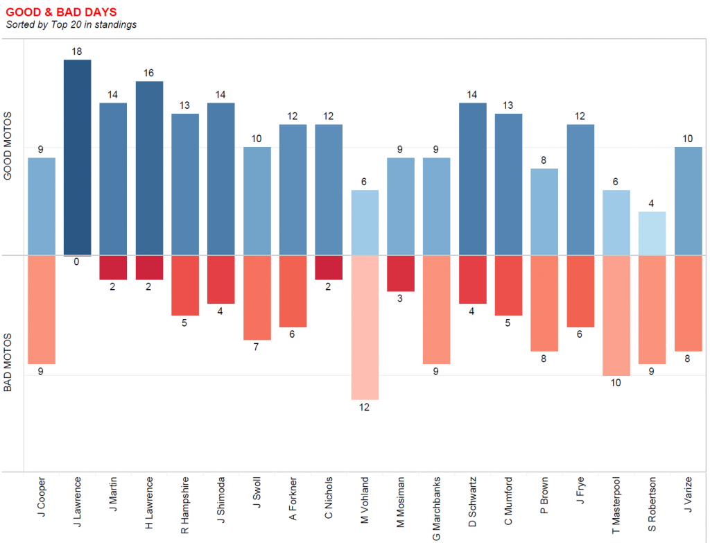 The fact that he doesn’t have a bigger lead is even more surprising when you consider he’s rounded the first lap in either 1st or 2nd position in 15 of 18 motos. He’s been upfront and in the position to win a lot.