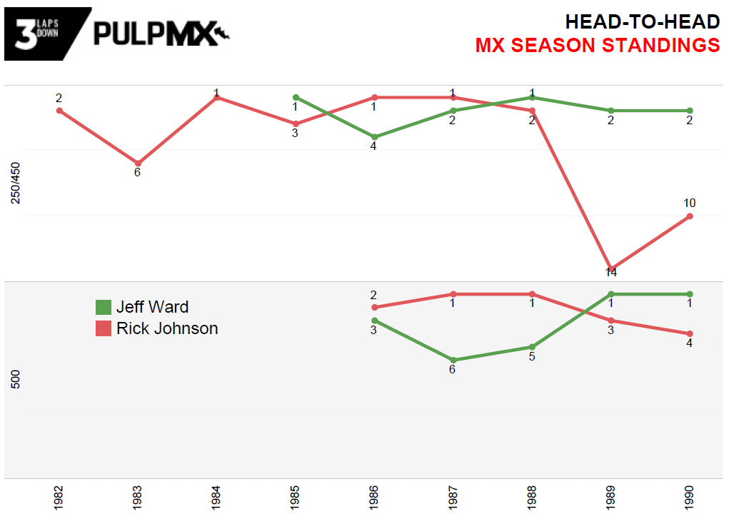 The Wardy vs. RJ supercross rivalry was dominated by injuries. RJ had injuries in 5 of 10 seasons while Wardy had injuries in 3 of their 10 head-to-head seasons. They only competed against each other in one complete season. That was 1985 and Wardy took the title that year.