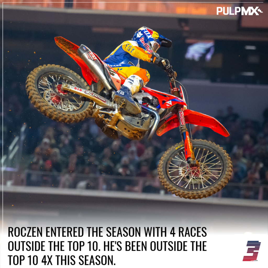 Ken Roczen (9th, 133 points). Last year, Roczen left Daytona with a 2 point lead. This year, he’s -70 points back of Eli Tomac. It’s been a very different 2022 season and there’s one stat that describes it perfectly. He’s finished outside the Top 10 4x. Think about this for a moment… he had finished outside the Top 10 4x in his first 107 career starts. He’s now finished outside the Top 10 4x in just 9 starts in 2022. At this point, we have to start the conversation about Ken Roczen joining Damon Bradshaw as one of the best to never win a premier class supercross title.