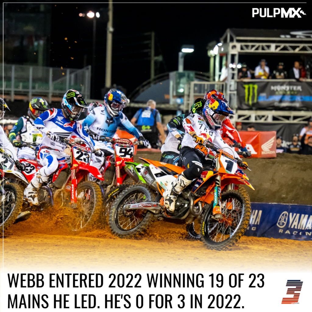 Cooper Webb (3rd, 170 points). Entering the 2022 season, Webb had won 19 of 23 races he led. Think about that for a second… he won 83% of the races he’s led. When he got into the lead you could all but guarantee he was going to win the race. It’s a testament to his determination and never give up attitude. But he’s now gone the longest without a win (9 rounds) since joining KTM in 2019 and he’s led 3 races and has 0 wins. He’s nearly doubled the number of races he’s led and not won in the first half of this season. It’s uncharacteristically Cooper and that’s why it sticks out as the stat of his season so far.