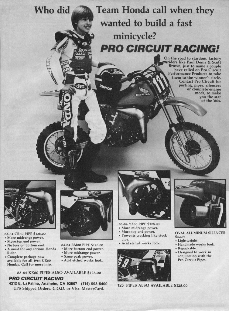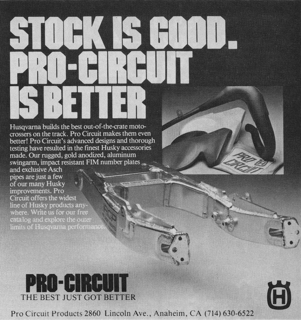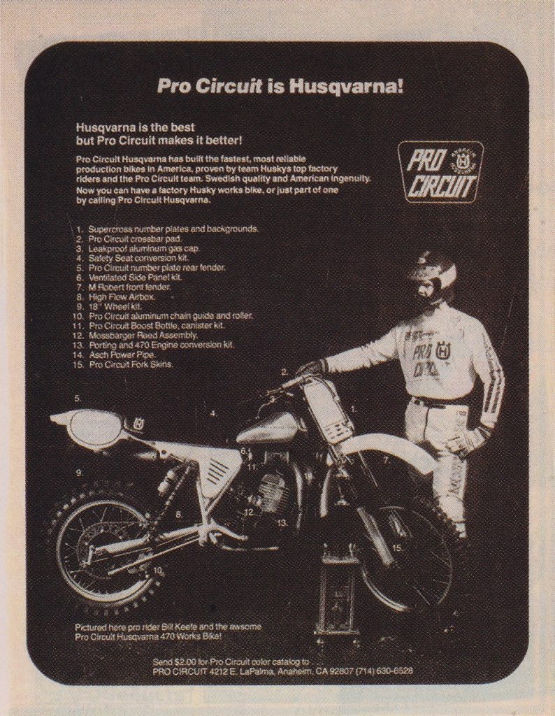 In the early eighties Mitch saw the writing on the wall for Husqvarna and diversified his business toward catering to all of the Big Four Japanese brands. Early eighties ads like these tended to focus on the mini class where Pro Circuit was quickly developing a grassroots following.