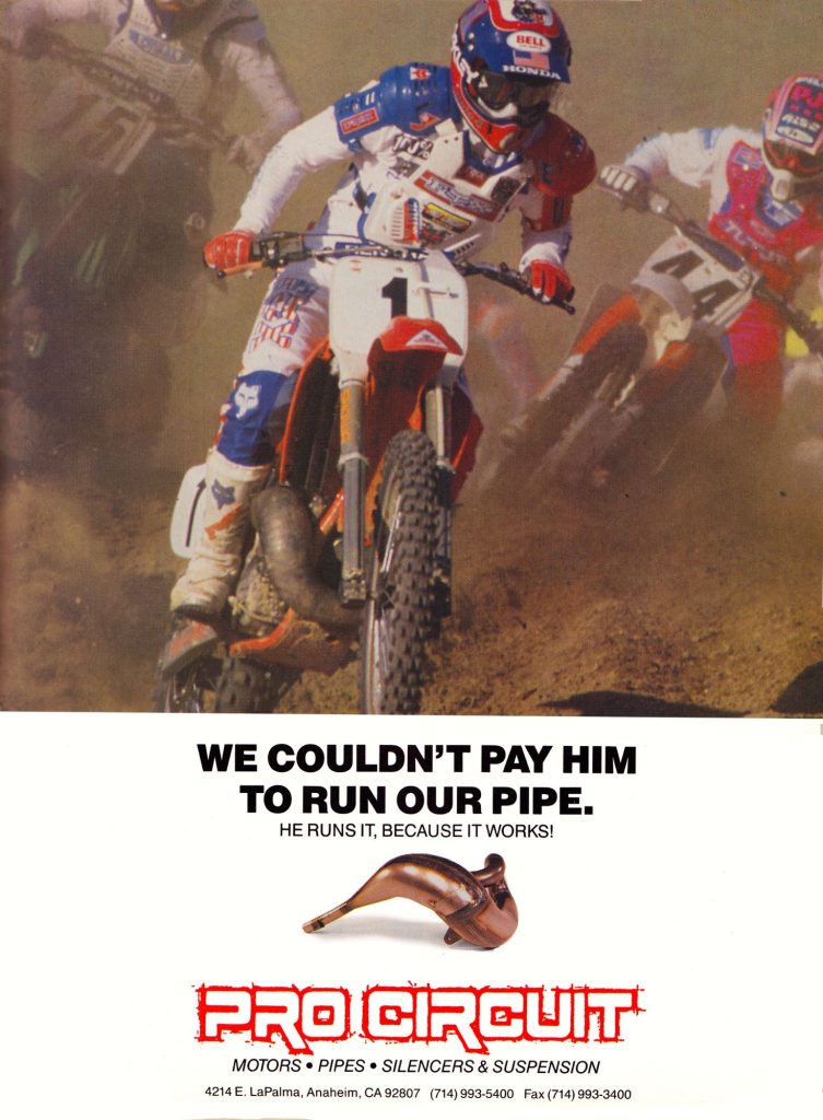 Pro Circuit’s biggest break of all came in 1986 when Honda’s newest hire Ricky Johnson chose to run their pipes over the HRC version on his Supercross racer. Johnson preferred the delivery of the PC pipe indoors and went on to dominate racing over the next four years. His endorsement was invaluable in catapulting Pro Circuit to the upper echelon of high-performance brands. Photo Credit: Pro Circuit
