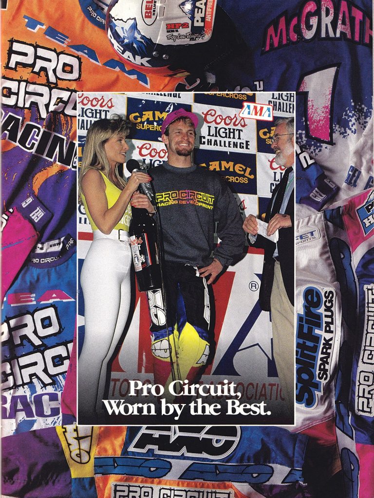 The 1992 season was an amazing one for the brand with Damon Bradshaw and Jeremy McGrath dominating the 125 and 250 indoor series using PC products. While McGrath would back up his 1991 win with another 125 title, Bradshaw’s season would end on a sour note at the season finale as Jeff Stanton bested him for the 250 title. Photo Credit: Pro Circuit