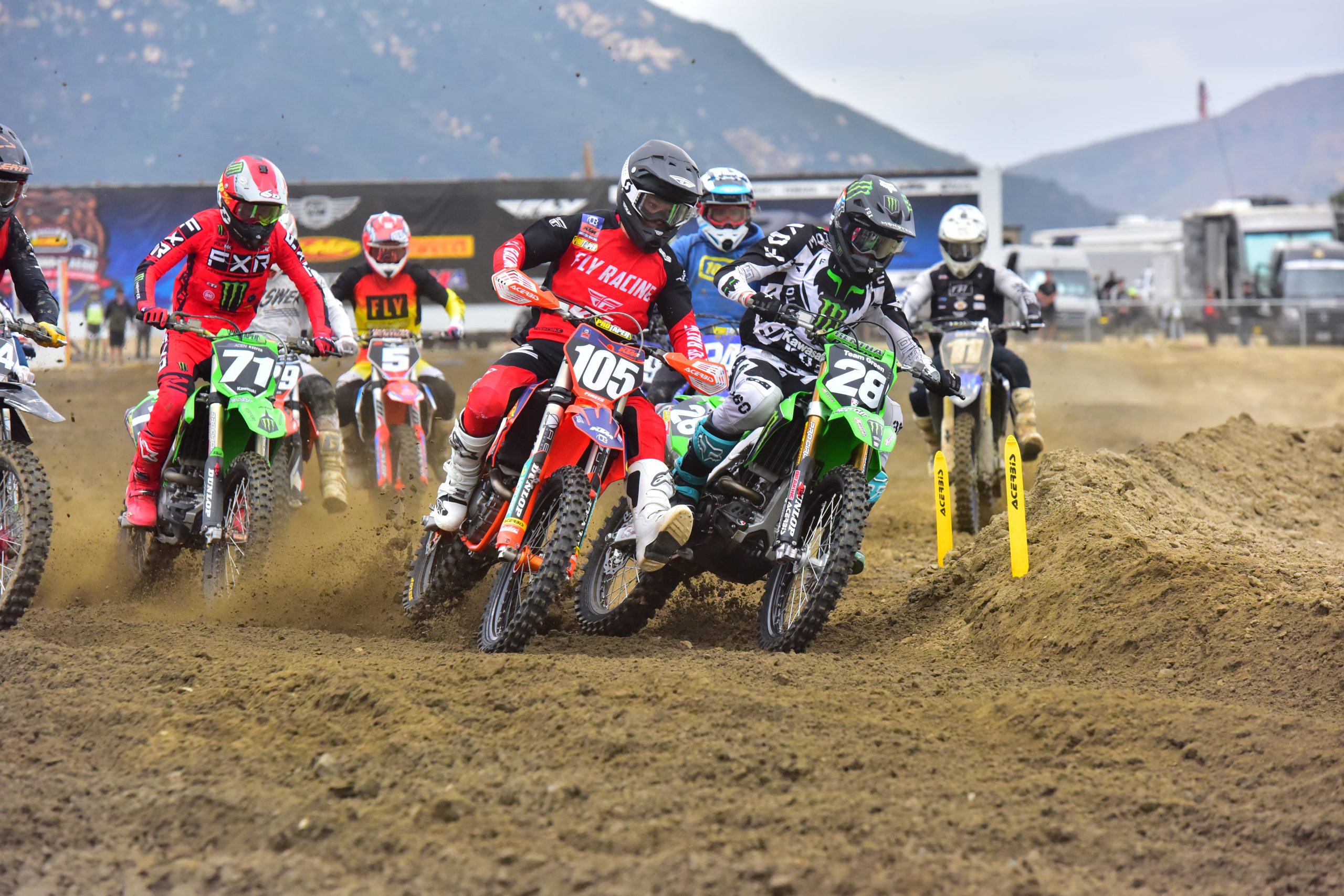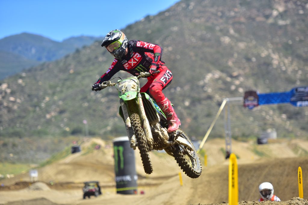 The Track: Fox Raceway (or Pala) gets really weird bumps during these amateur races! The track is being raced on by 50s, 65s, 85s, 125s, etc so the corners form different as well as the bumps coming into and out of corners. This has my mind spinning! As a test rider, I am feeling things on my own bike that I don’t normally feel. I usually have to go softer on my suspension settings than I normally run because of how much chop there is. That chop usually starts really early coming out of the corners and begins early as well coming into them. Fox has softer dirt (for Cali standards) and some heavy high speed compression loading jumps so it makes it tough for set up! The track crew did a good job on prep each day as the early motos usually had a bunch of Dunlop MX12s on the back of riders bikes to get out of the gate well. However, in typical Cali fashion the base is hard so 75% of track gets baked and hard packed. East coast riders usually have a harder time with Fox Raceway as it gets confusing. Overall, the layout was safe and fun for a wide range of riders.