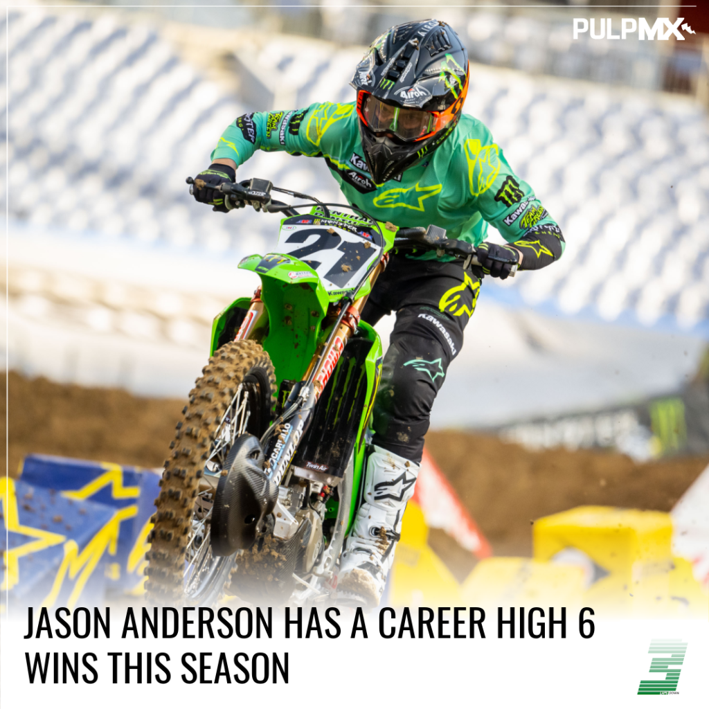 Jason Anderson has re-emerged as a title contender. He’s not entirely topped his 2018 championship season, but his 6 wins this season nearly double his career total. He started the season with 7 wins and now has 13. He’s also led 10 mains and 124 laps, both series leading stats and career bests. Green is good for Jason!