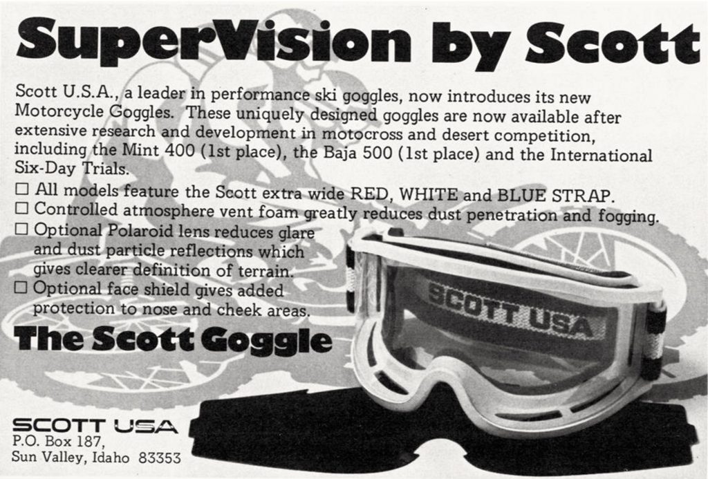 One of the pioneering companies of early American motocross, Scott USA used its years of ski industry experience to revolutionize motocross goggle design in the early 1970s. Photo Credit: Scott USA