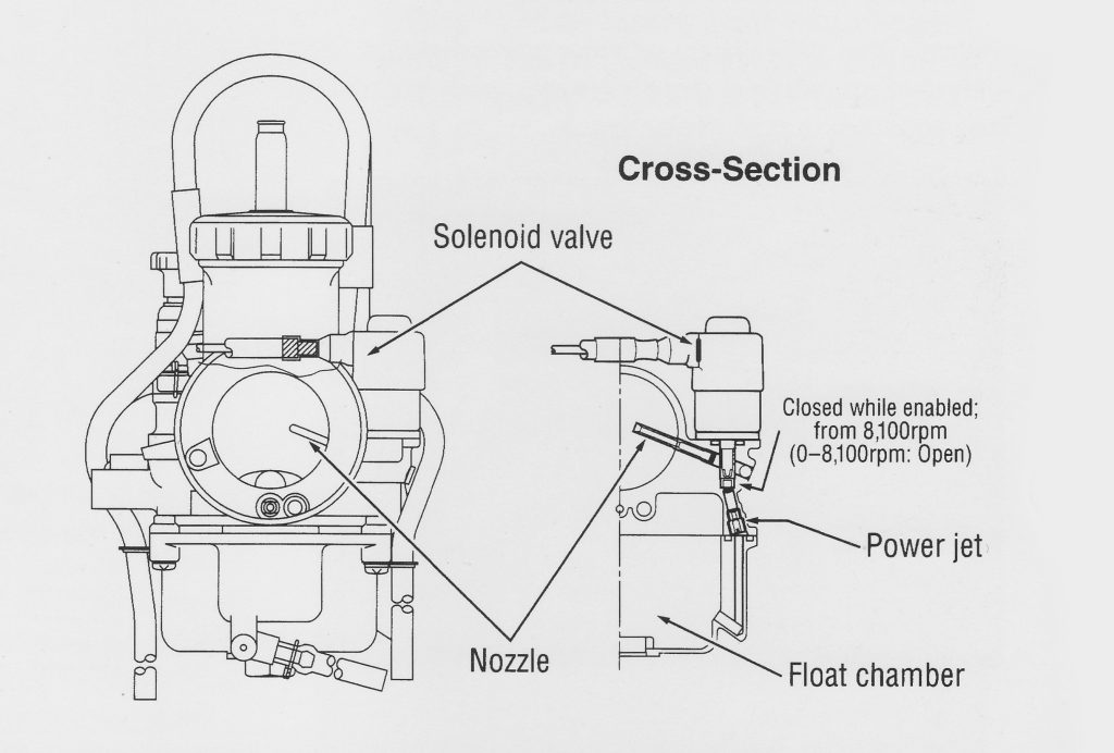 In 1997, Honda added Keihin’s latest innovation – the “PowerJet” – to the carburetor on the CR250R. The theory behind the PowerJet was to provide additional fuel at lower rpm for improved throttle response without overly enriching the fuel mixture at high rpm. An electric solenoid mounted to the carburetor controlled the secondary fuel circuit and opened and closed the valve as needed to optimize fuel delivery. Photo Credit: Honda