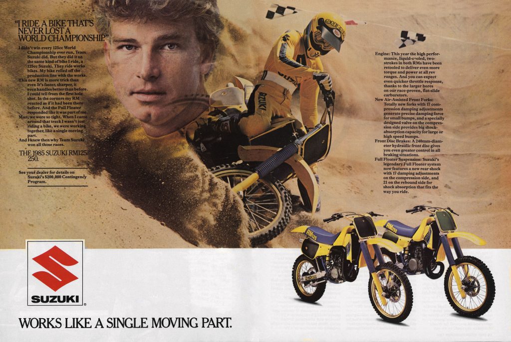 With Suzuki’s motocross struggles over the last few years it might be hard to remember what a powerhouse they were in the 1970s and early 1980s. As this ad states, Suzuki was undefeated in 125 Grand Prix competition, winning every 125 World Motocross title run up to this point. When Finnish motocross legend Pekka Vehkonen captured the title for Cagiva in 1985 it was the first loss for Suzuki since the championship was created in 1975. Photo Credit: Suzuki