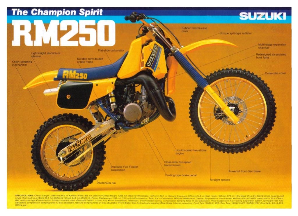 Like its smaller sibling, the RM250 was no powerhouse in 1985 but this was less of a handicap in the 250 division. Well-suspended and easy to ride, the RM250 was a great do-it-all machine for those who prized overall competence over blistering motor performance. Photo Credit: Suzuki