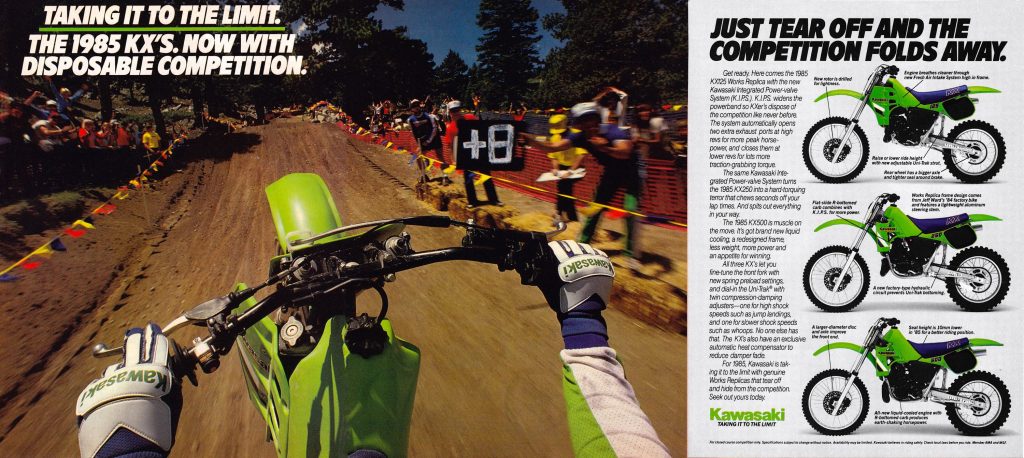 1. This is the bike that could have been the star of 1985 250 class. It was so close, yet so far. Most of the So Cal racing guys were buying the 1985 Honda CR 250 due to hop up potential, reliable motor, reliability and sweet looks. My friend Chris was the first of our group to race the 1985 KX 250. His bike was used but looked clapped out for a newly used 85 bike from that period. Another buddy John sold his 1980 YZ 250 for $900 and bought his brand new 1985 KX 250 for $$2200 out the door from Mission Viejo Kawasaki / Honda. After bringing it home and test riding it out on the street, realized the clutch and transmission were a disaster. The clutch was like a light switch, all or nothing. No slipping the clutch whatsoever. The transmission was just as much of a nightmare. The engine and suspension were decent. Compared to my older 1985 Honda CR 250, this lightly used KX 250 seemed clapped out and worn out too early. By buddy immediately sold his 1985 KX 250 for a lightly used 1985 CR 250, to which he owns to this day. The 1985 KX 250 had so much potential other than the clutch, tranny and ages too quickly.