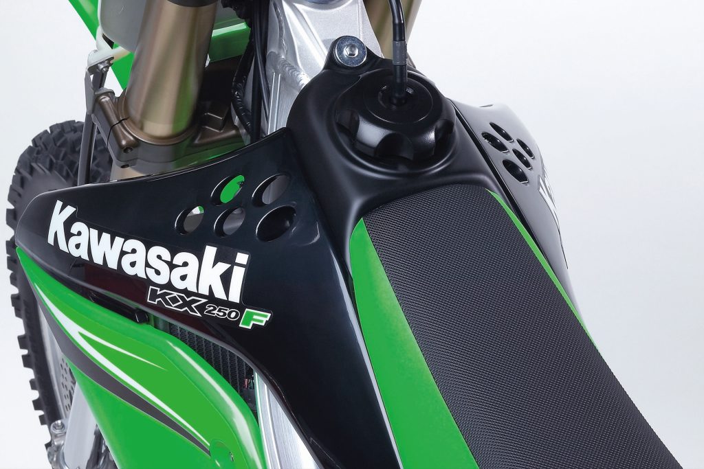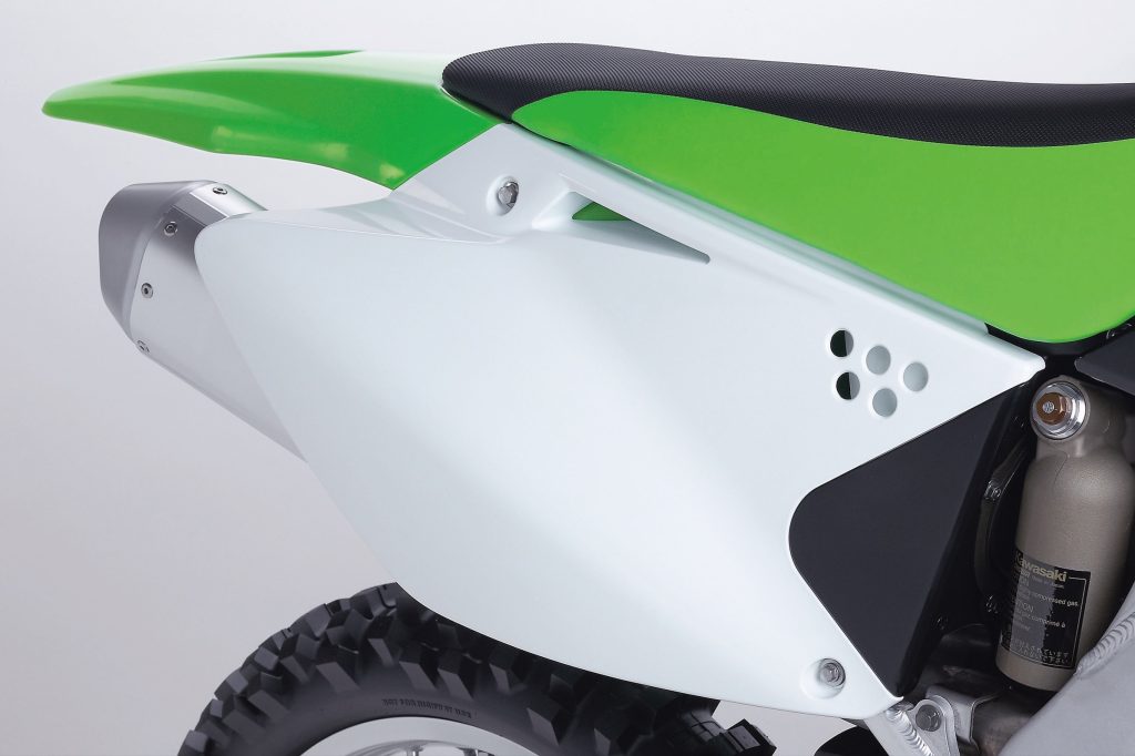 The KX’s new bodywork was handsome and functional with handholds and vent holes built into the side plates to improve engine breathing and make lifting the machine easier. As an additional unexpected benefit, aftermarket exhausts for the 2005 KX250F were designed to bolt directly onto the new 2006. Photo Credit: Kawasaki