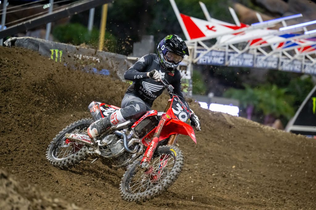 Jason Anderson: Damn. This dude is on rails. The Monster Energy Kawasaki looks to be balanced and set up well for the whoops as well as the corners. Kudos to Kaipo Chung (Kawasaki’s/Showa Suspension Tech) for getting JA a set up he likes! Also, shout out to Broc Tickle for busting his ass on the 24 KX450 platform to in order to get JA some base settings. From what I am told Jason is actually a good test rider and can feel his way around the bike pretty damn good. JA got a penalty last moto that knocked him down to fourth place on the night but from what I can see this 2024 Anderson looks to be here to play and bust out some rhythms that some others will not do. That triple out passed the mechanics area looked gnarly and he was one of only three to do it consistently all night long. That shows us fans that a rider is comfy.