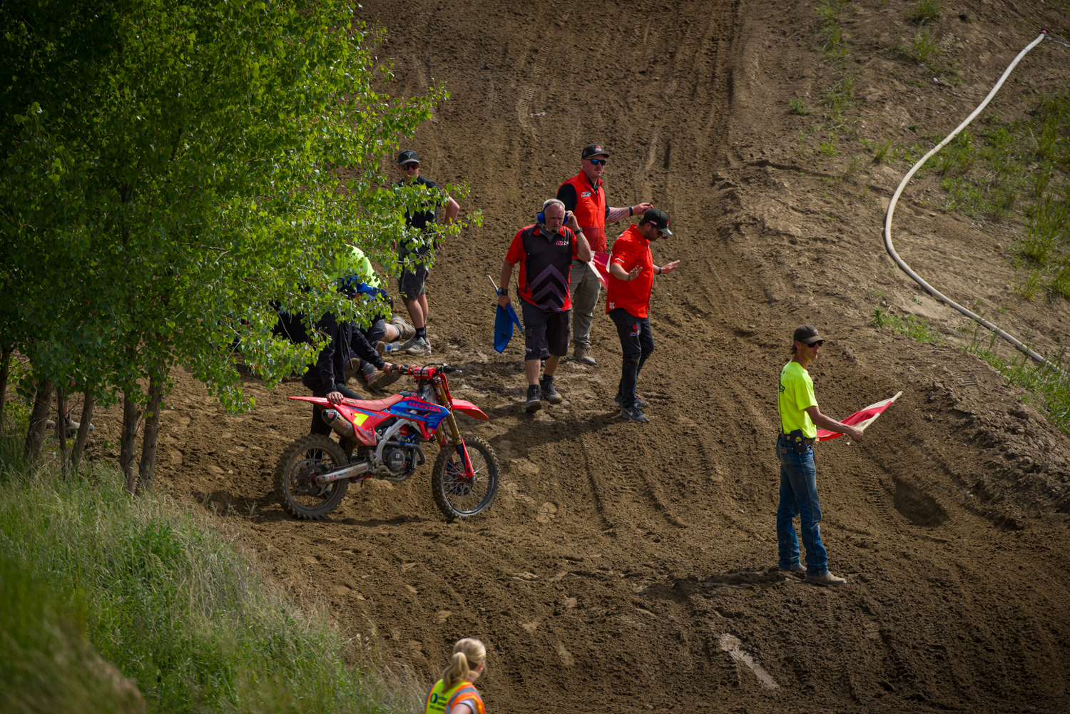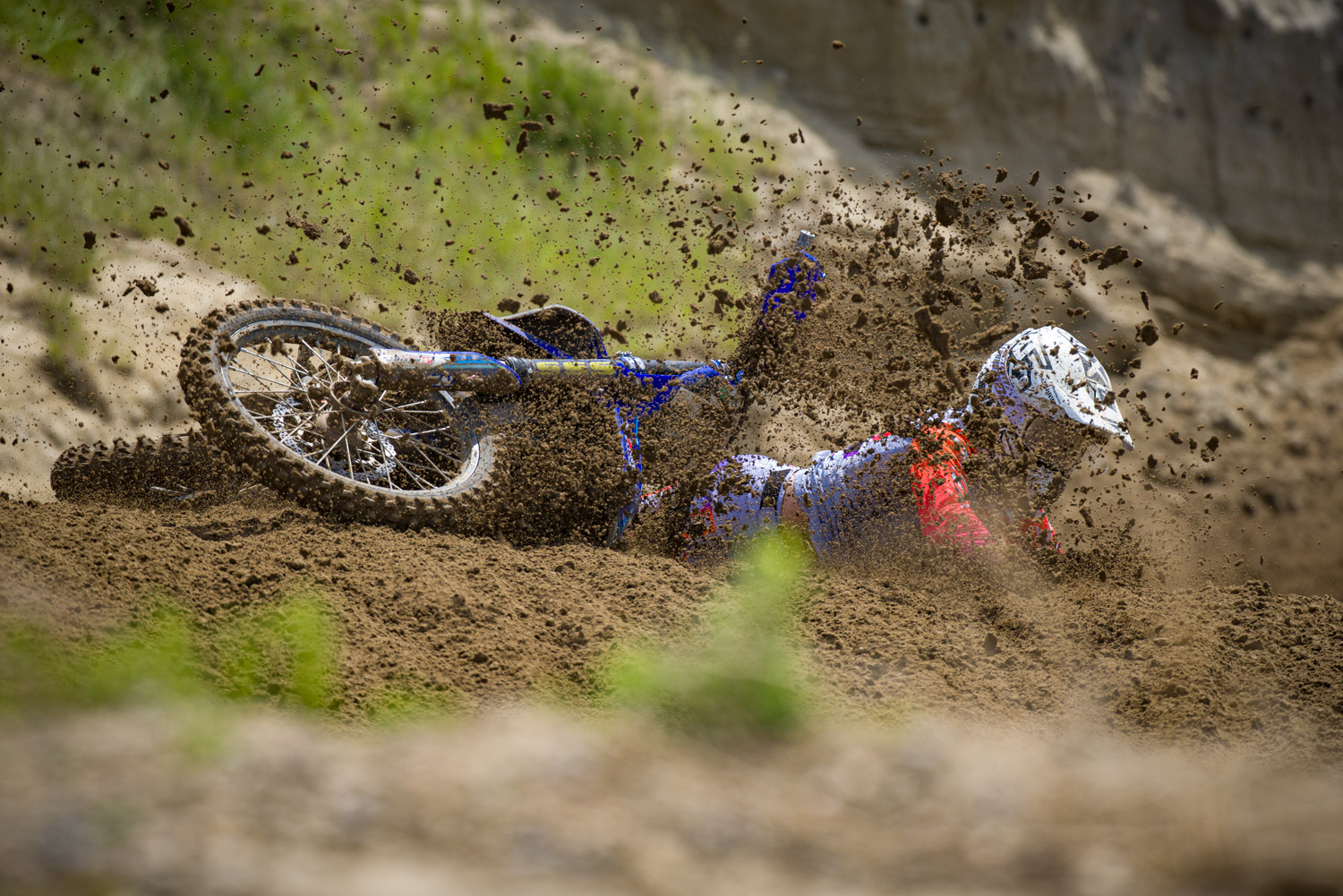If it wasn’t for this crash in moto one, and the subsequent mechanical DNF he suffered from it, Sebastien Racine would have been an easy podium pick. He was in second when he crashed, remounted, worked his way back to second before his bike cut out and ended his race. He came back to grab second in moto two, his first moto podium since switching to the MX101 Yamaha team.