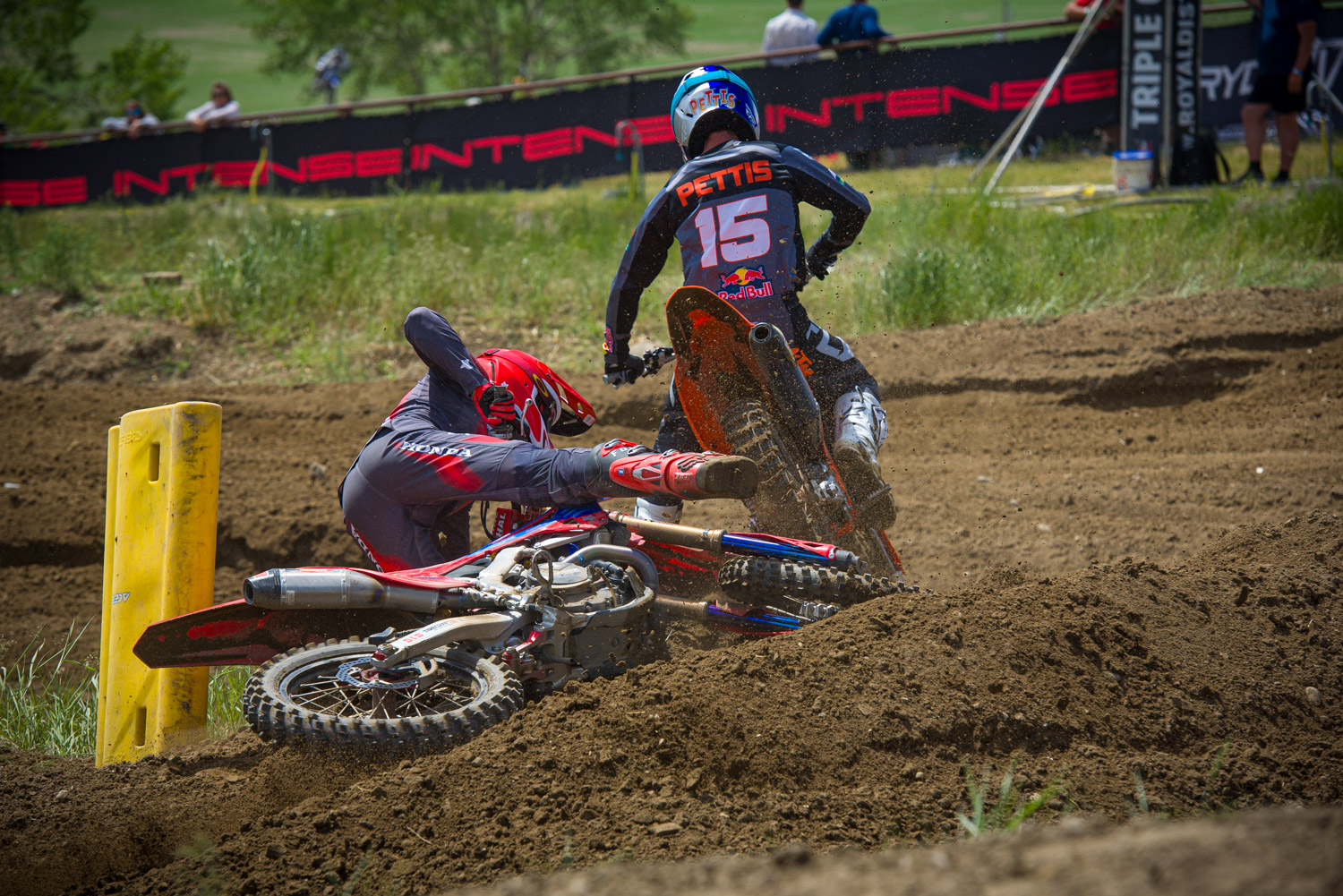 With Wright’s crash, it now looks like it’s Pettis’ title to lose.While leading the second moto, Wright got kicked over the bars in an extremely ugly crash that left him unconscious for quite a while. The race was red flagged and eventually the decision to cancel the rest of the race was made. Wright was transported to hospital but has been alert and talking. No word yet on what the recovery timeline will be for the 4-time champion.