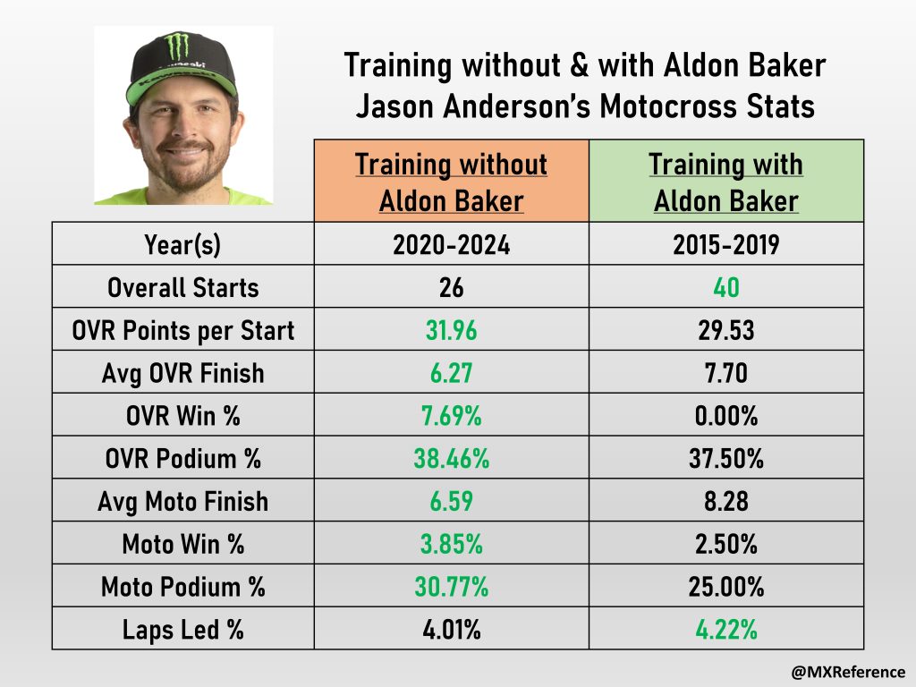 Despite the various sample sizes, it is consistent that the riders almost entirely have better figures while training with Aldon Baker during the outdoor season. Jason Anderson is the only exception to this with a large enough sample size.
