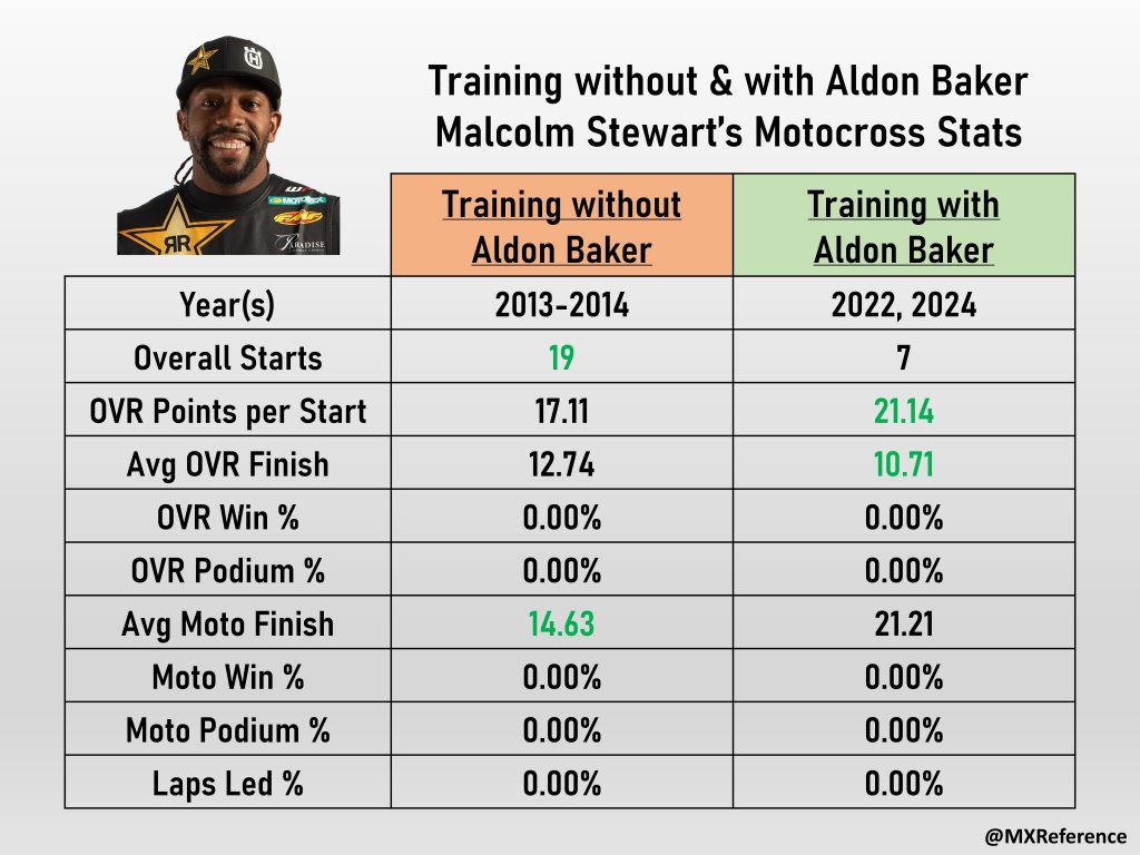 Back to small sample sizes. Malcolm Stewart started training with Aldon Baker when he moved to factory Husqvarna in 2022. He has dealt with injuries the last few years only racing seven outdoor races. Its hard to compare, especially when Mookie’s other 450 Outdoors stats from 2013-2014 are eight years apart from his recent results.
