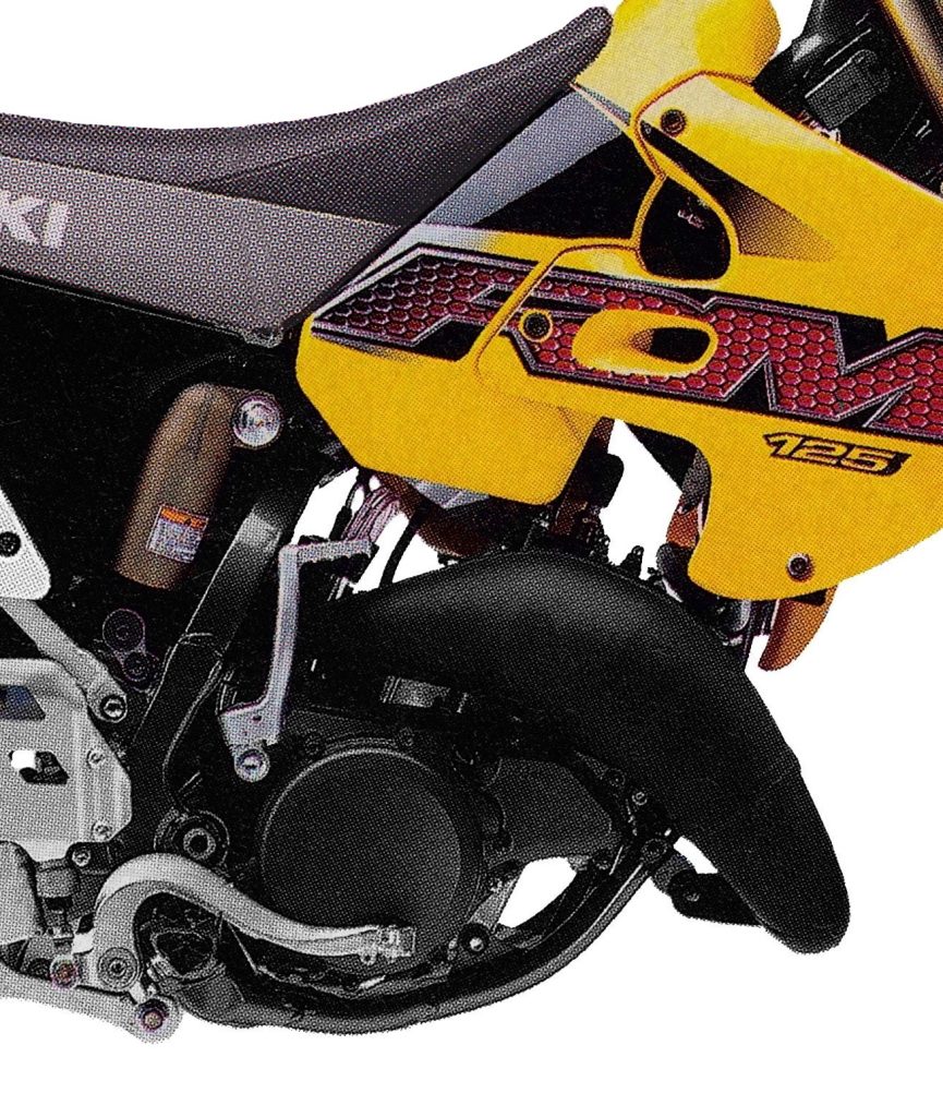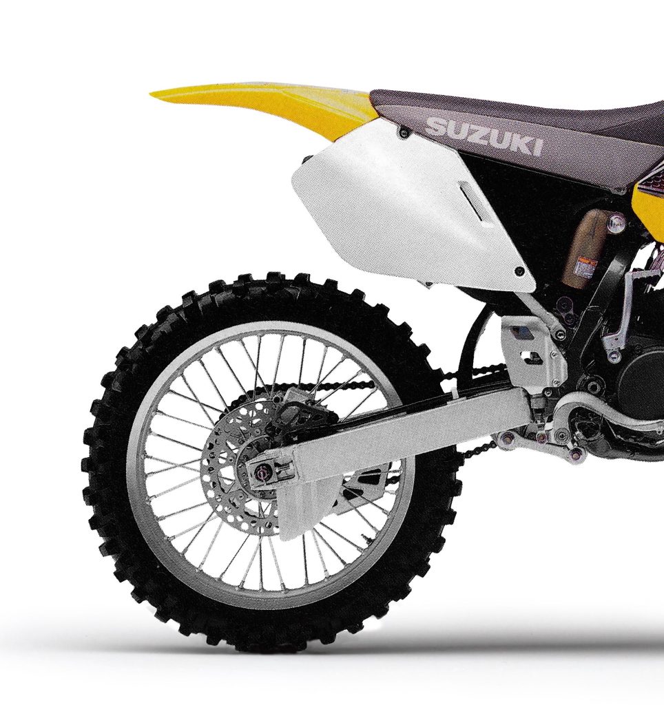 With an all-new machine in the wings for 2001, Suzuki entered the last year of the 1996 RM’s design cycle with a list of refinements for their proven 125 platform. Riders already loved the RM’s feathery feel and quick handling, so the chassis updates were limited to additional reinforcements to the lower cradle to increase rigidity. The shock mounting was also beefed up to reduce flex and the detachable alloy subframe was shortened by 10mm to improve ergonomics. A new swingarm was added with a 10mm increase in the height of the cast portion for added strength and the diameter of the rear axle was enlarged by 2mm to provide a more precise handling feel.