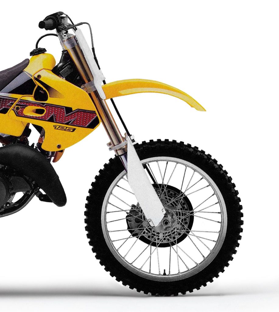 Shock performance on the 2000 RM125 was only slightly better than the stock forks. Most riders felt it could be raced in stock condition, but the action was busy in the rough and not particularly plush. Photo Credit: Suzuki