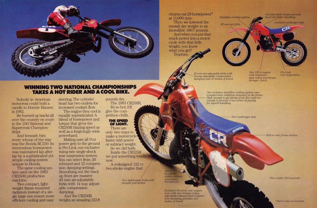 The all-new 1983 CRs bore more than a passing resemblance to the ultra-trick factory Honda RCs ridden by the race team in 1982. Photo Credit: Racer X