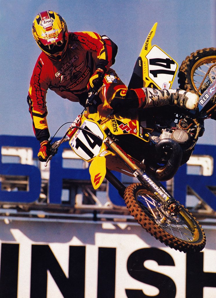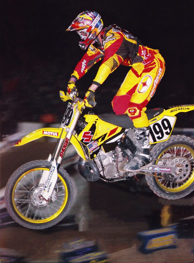 Kevin Windham’s move to Suzuki from Honda was big news in 2001. He would fail to deliver a victory indoors, ending the series in 4th overall, but a much better outdoor campaign would see him score two overall victories and end the series in second behind Kawasaki’s Ricky Carmichael. Photo Credit: Simon Cudby