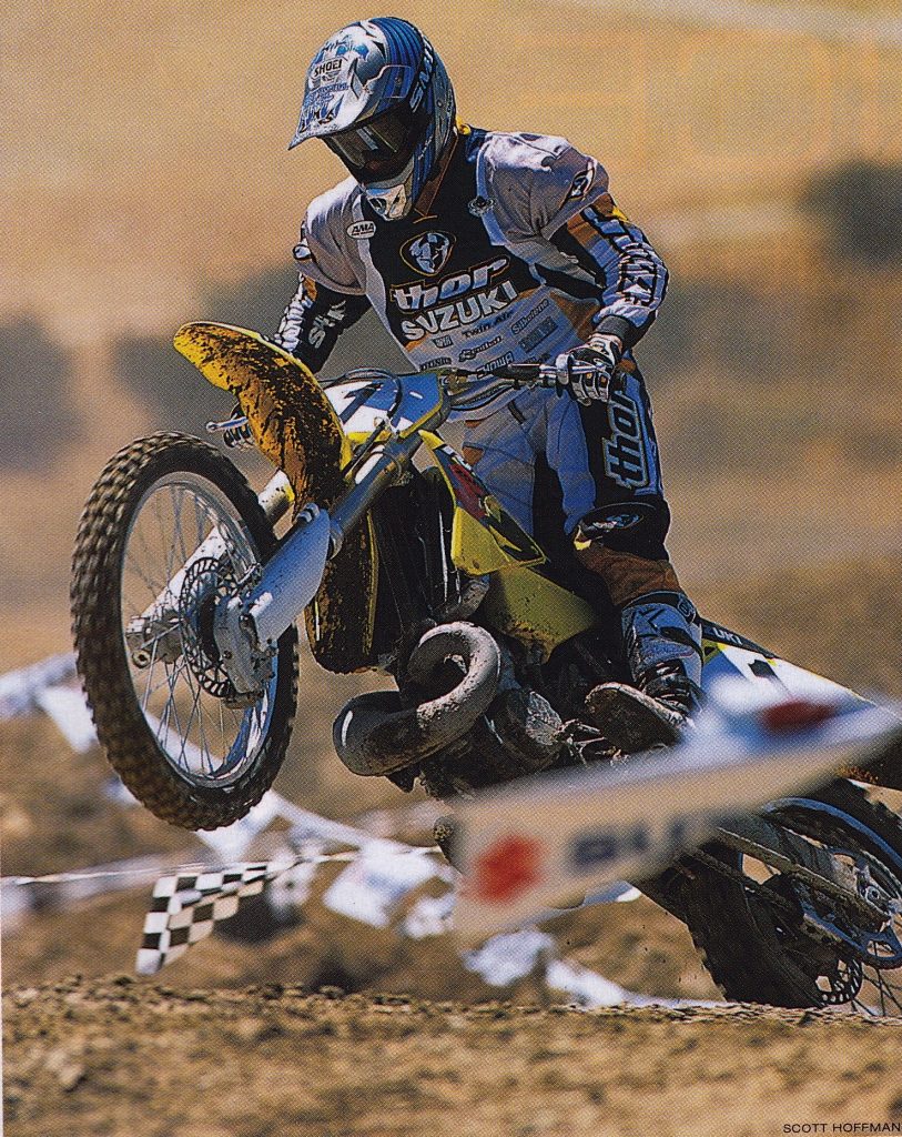 Suzuki’s biggest star in 2001 was 2000 125 National Motocross champion Travis Pastrana. Technically still a 125 rider, Pastrana stepped up to race the RM250 in a few select events in 2001. Carding a fifth in the Anaheim season opener, many had Pastrana pegged as the sport’s next great champion, but unfortunately, injuries and a lack of focus would derail the incredibly talented rider’s career before it could reach its full potential. Photo Credit: Dirt Bike