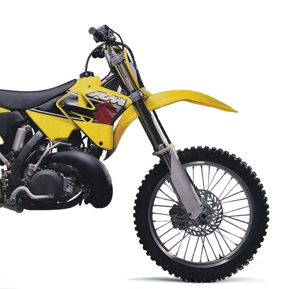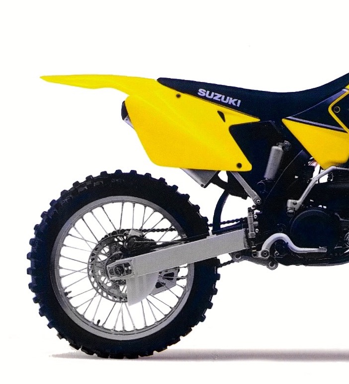 After several years with Showa, Suzuki moved back to Kayaba suspension in 2001. The new 46mm KYB forks were very similar to the well-regarded units found on the KX250 but the settings chosen by Suzuki resulted in less impressive results. Both the springs and valving were very light, and the forks tended to blow through their stroke and bottom on hard hits. The soft springs allowed the fork to sink deep into the travel and this also led to a harsh spike in the midstroke as the heavier damping kicked in. For any serious racer stiffer springs and a revalve were advisable. Photo Credit: Suzuki