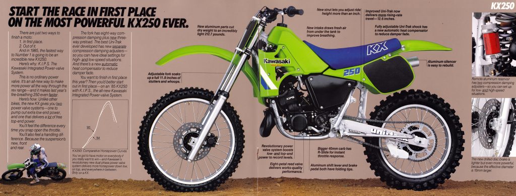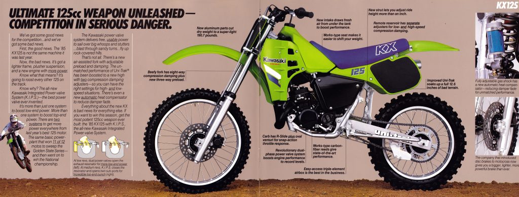 In 1985, the KX125 was the Top Fueler of the 125 class. The arrival of the Kawasaki Integrated Power-valve System (KIPS) widened its already impressive horsepower advantage. In 1985, the green machine was the hot ticket to the winner’s circle in the 125 class. Photo Credit: Kawasaki