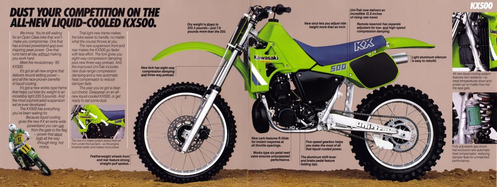 Jeff Ward and a works version of the KX125 grace the cover of the 1985 Kawasaki KX brochure. In 1984, Wardy piloted this SR125 (Kawasaki’s internal works designation) to the first of his six AMA MX/SX National titles. Photo Credit: Kawasaki
