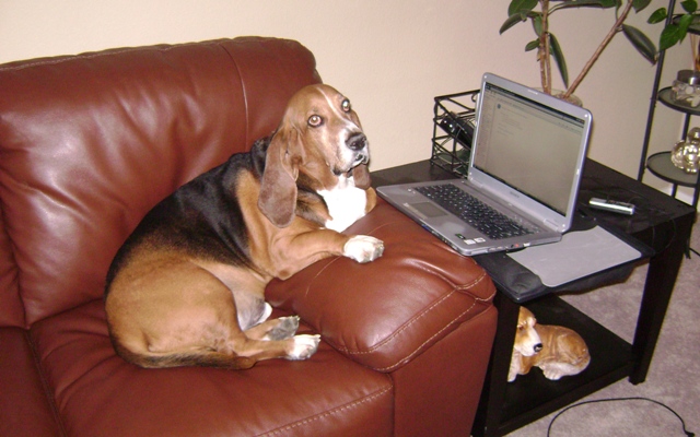 Here’s Hank getting ready to pound out another entertaining "Observations". See that Basset statue under the table? Some lady chased me down when I was walking the dogs and said she thought of me when she was going to…